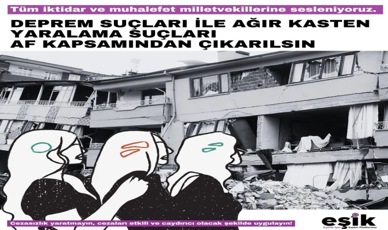 Kısa adı EŞİK olan Eşitlk için Kadın Platformu yazılı bir açıklama yaparak " DEPREM SUÇLARI İLE AĞIR KASTEN YARALAMA SUÇLARI AF KAPSAMINDAN ÇIKARILSIN dedi.