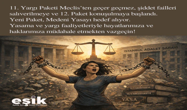 EŞİK tarafından yapılan yazılı açıklamada,11. Yargı Paketi Meclis’ten geçer geçmez, binlerce kadına ve çocuğa karşı şiddet faili salıverilmeye başlandı. Biz, kadınları faillerin işleyebilecekleri yeni suçlara karşı önlem alın diye uyarırken, canımızı koruma peşindeyken şimdi de 12. Yargı Paketi konuşulmaya başlandı.